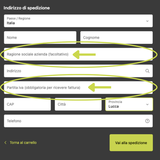 Una volta raggiunto il check-out, avrai la possibilità di inserire sia la Partita IVA che la Ragione Sociale nei relativi spazi. Appena avrai concluso l'ordine, il nostro team provvederà immediatamente all'emissione della fattura.